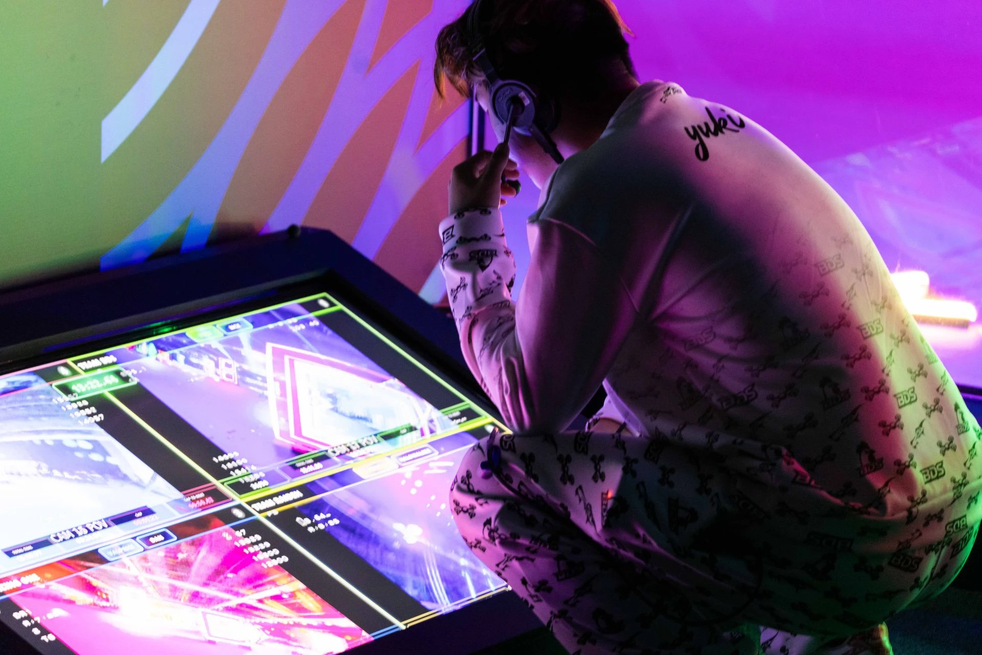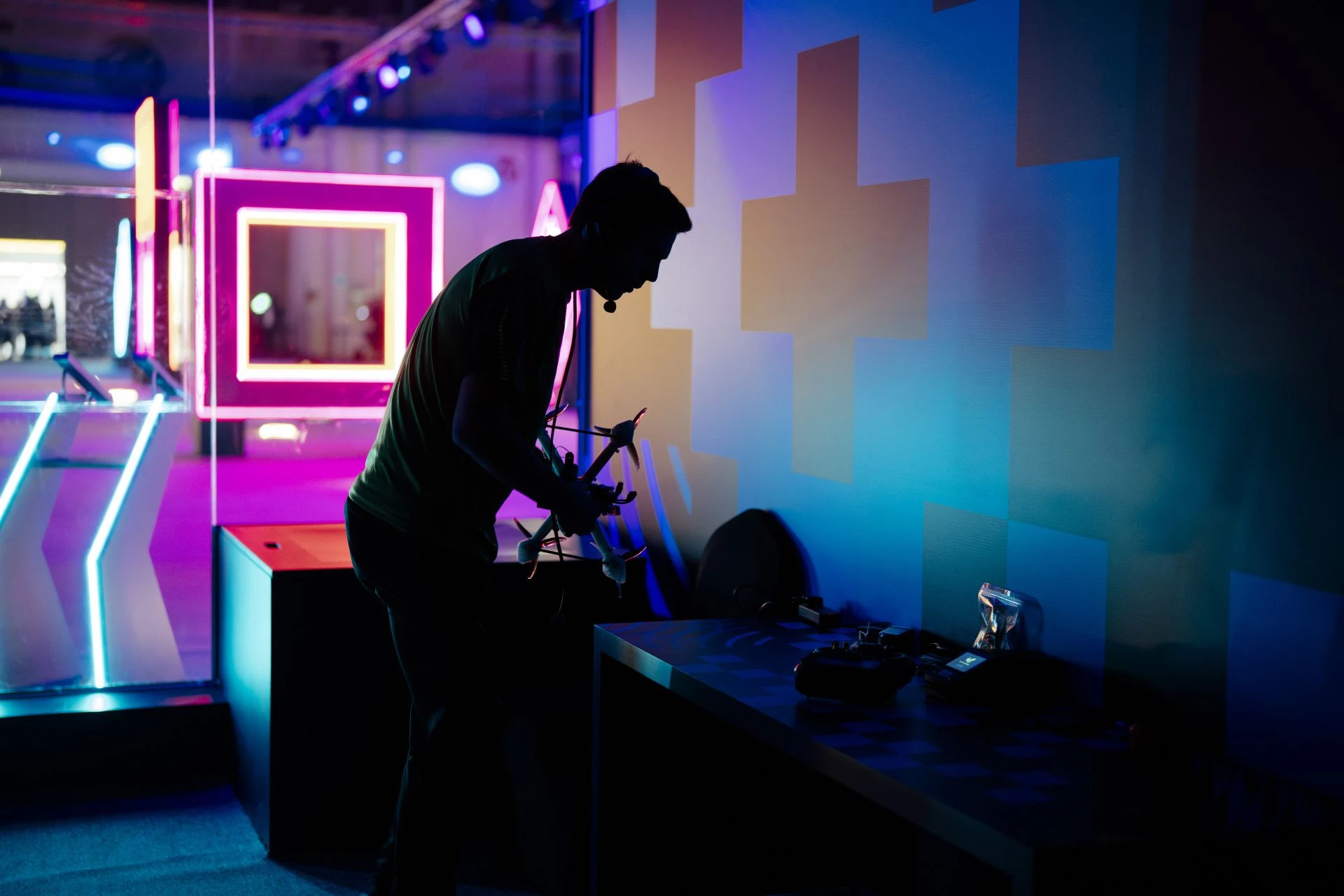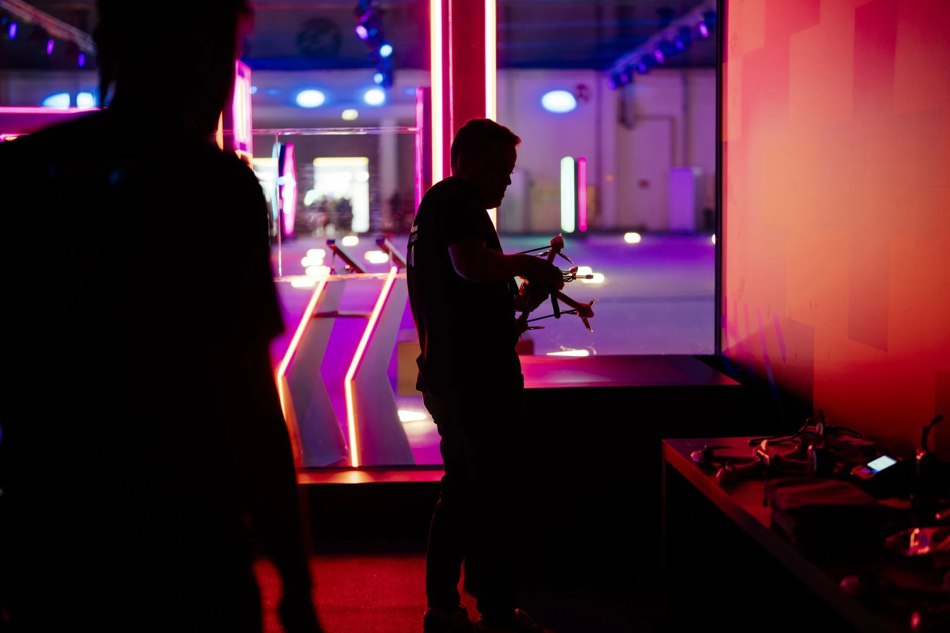 Each team has two athletes, known as pilots. During the main stage races, the first pilot starts from the ‘start area’ (where pilots control the drone that is racing) and the second pilot is based in the ‘pit stop area’ (where battery replacement and drone repairs are completed). Each pilot must complete 25 laps. Once the first pilot has completed that, the pilots switch over roles and swap places in the two areas.
